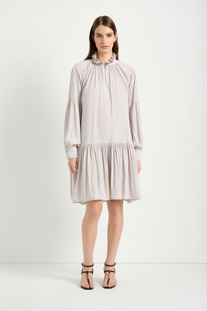 Crafted from a woven, non-stretch fabric, the Meridian Dress showcases a frilled collar and stand for a chic look. The gathered flared hem adds a whimsical touch to the design, while the long gathered sleeves feature a placket and button closure for added detail.