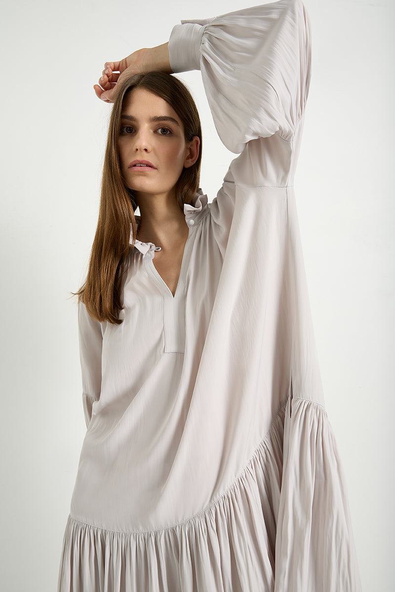 Indulge in the luxurious Mache fabric by Mela Purdie with the Meridian Dress, a timeless piece with a contemporary flair. This elegant dress features a relaxed fluidity and smooth lustre surface, along with long gathered sleeves and a frill neck detail that adds a touch of sophistication.