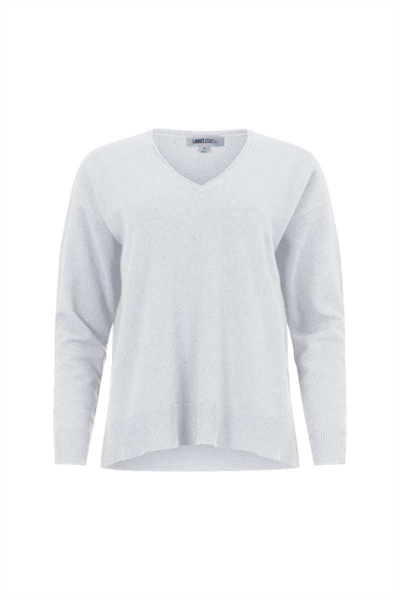 Luxurious cashmere V-neck sweater, with pointelle detail around neckline and cuff, and side splits.