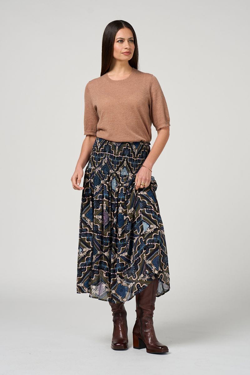 The deep elasticated shirred waistband creates a flattering, flexible fit that sits comfortably on the waist, making it an easy pull-on style for everyday wear or elevated occasions. Finished in the Olive Multi colourway, the Regalia Skirt pairs seamlessly with the matching Regalia Blouse or a simple knit or shirt for versatile styling across seasons.