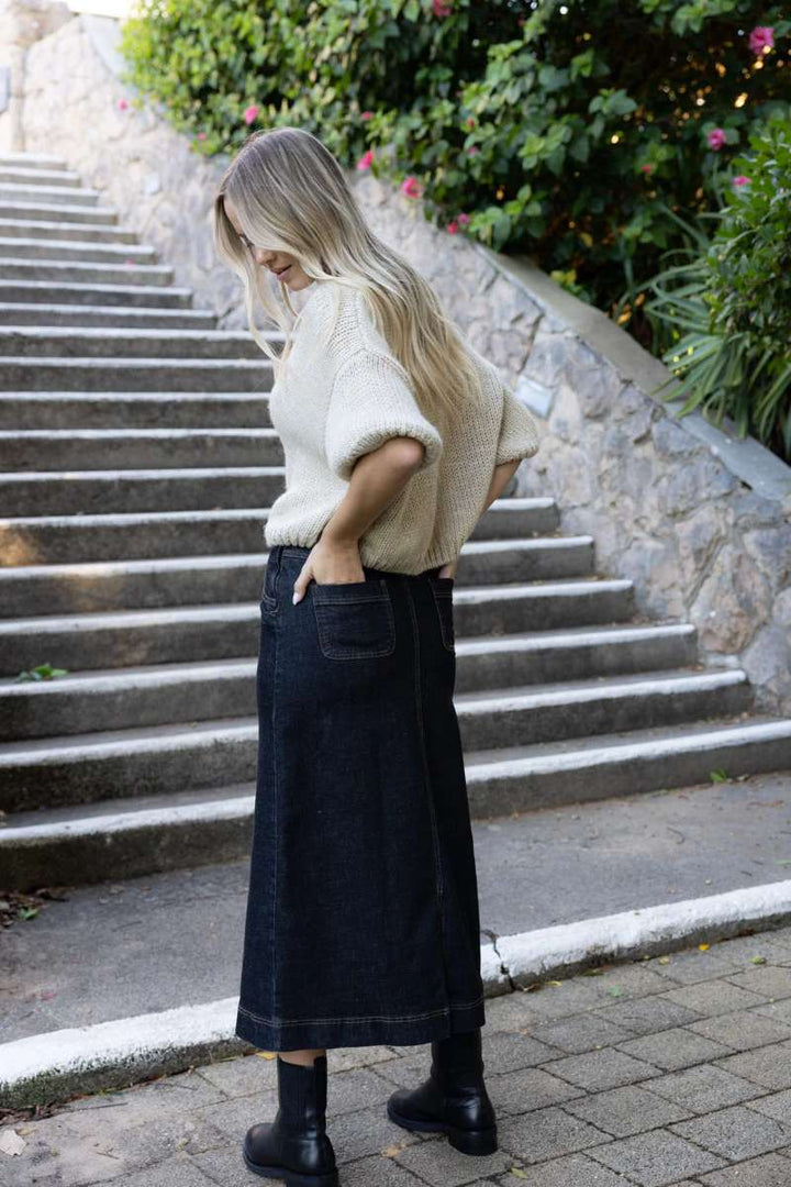 This gorgeous long denim skirt is a great winter staple! With just the right balance of mid-weight denim and comfortable stretch, Nevada molds perfectly to your shape giving a flattering fit. She’s a great base for so many looks year-round – paired here with our Neve jumper.