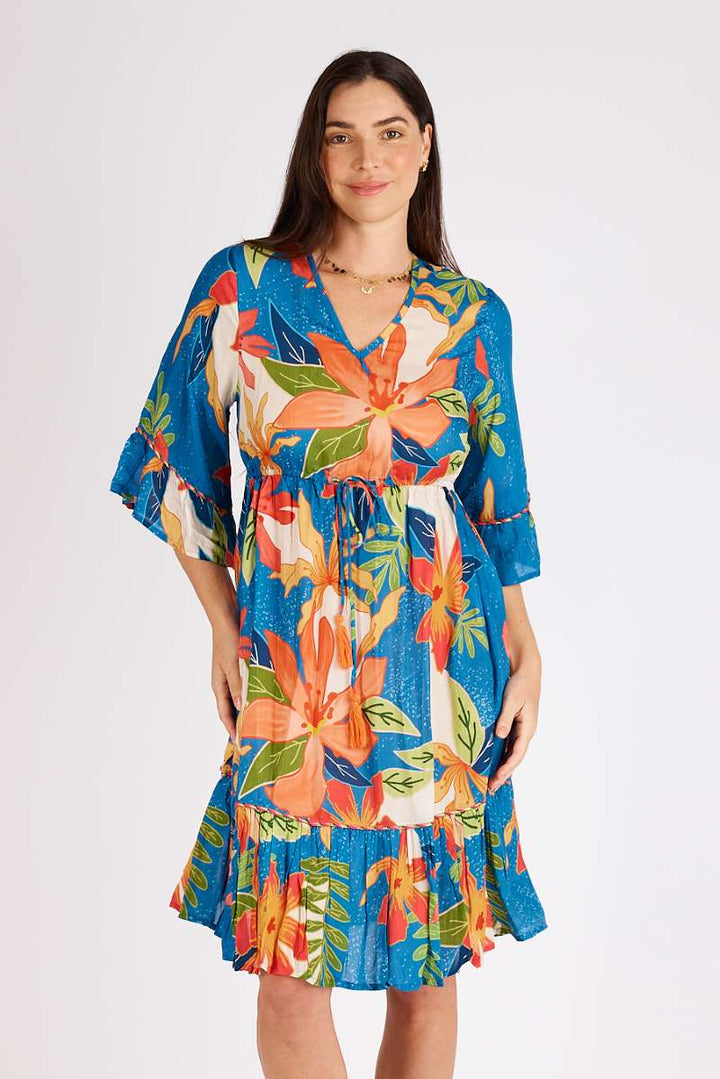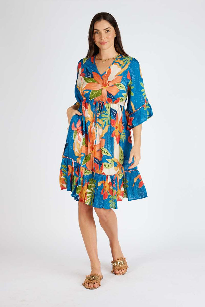 Welcome summer in vibrant style with the Lulasoul Sao Paulo Dress Sky. Enjoy this tropical-inspired dress, perfect for your next vacation. Crafted with high-quality fabric, its comfortable fit and subtle features make it a must-have travel piece. Feel effortlessly chic and show off your zest for life with this stunning dress.