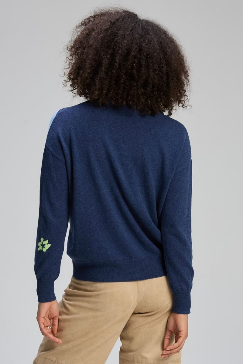 Set against a rich denim blue base, bold oversized floral motifs in fresh sky blue, lime, and soft neutral tones create a striking yet wearable contrast. The classic crew neckline and button-through front balance the playful design, while ribbed cuffs and hem provide gentle structure. It’s a statement knit that still feels timeless — perfect for brightening denim, neutral trousers, or layered over a simple tee.