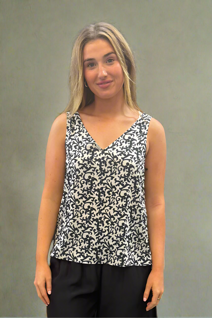 The Audrey Slip is a Mela Purdie offers a flattering soft v-neckline ideal for layering crafted in Mela Purdie’s smooth fluid stretch Charmeuse fabrication in a Navy & White based Quill print.