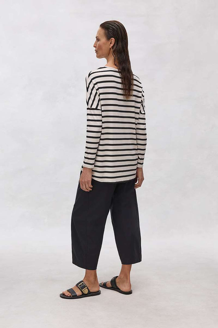 Experience the elegance of Mela Purdie's exclusively designed Trunk Striped Jersey. A mid weight, matte fabrication featuring bold black stripes placed on a neutral hue base. The Boat Sweater features dropped styled shoulder on a relaxed boxy silhouette.
