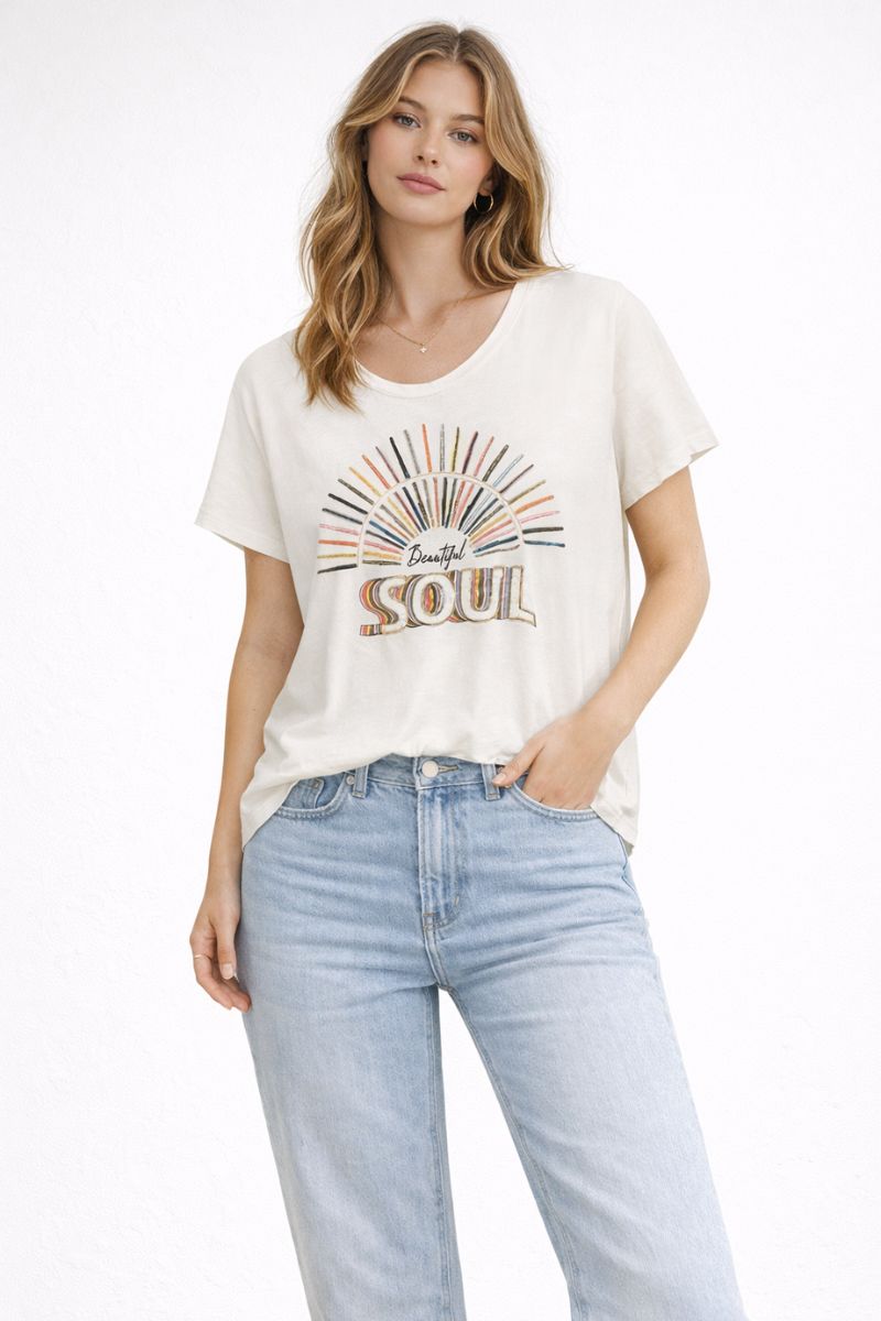 Relaxed, uplifting, and designed to make a statement, the Beautiful Soul T-Shirt by Mos Mosh is an easy everyday tee with a thoughtful, feel-good finish. Crafted in a soft cream colourway, this style features a half-sun motif with colourful rays, brought to life with assorted sequin detailing for subtle texture and shine.
