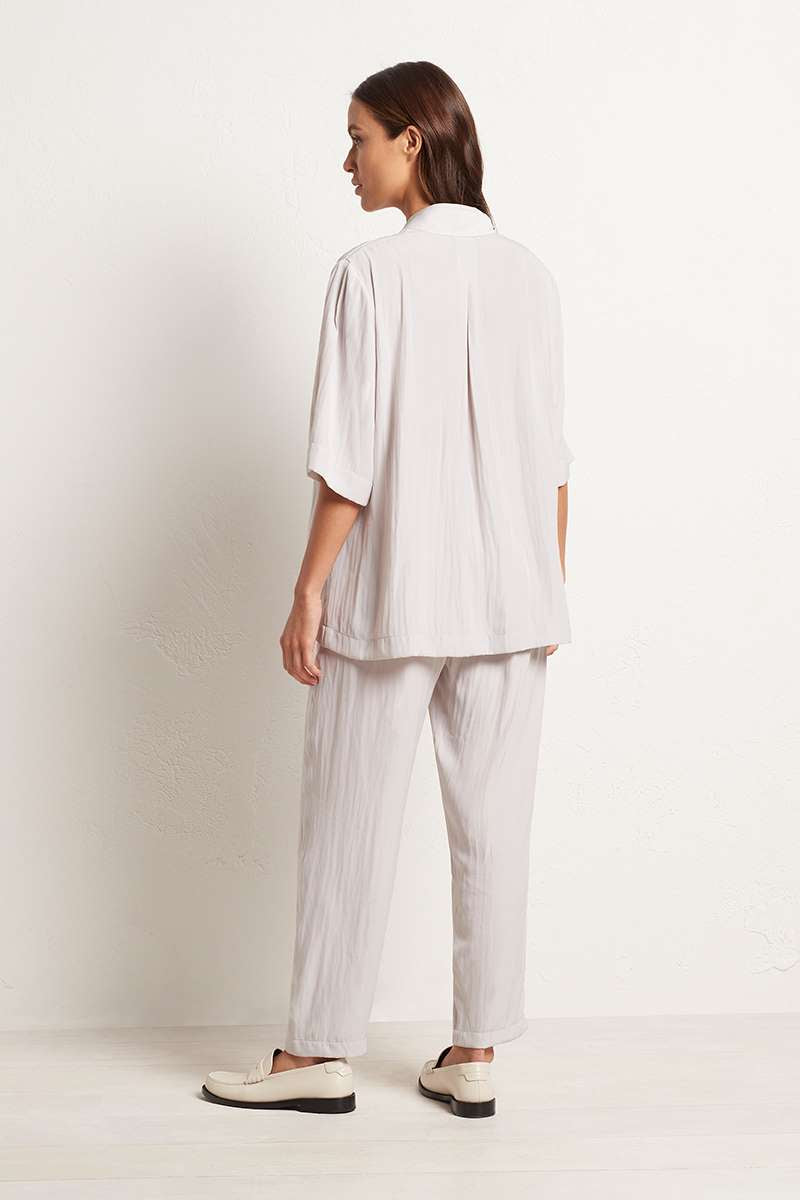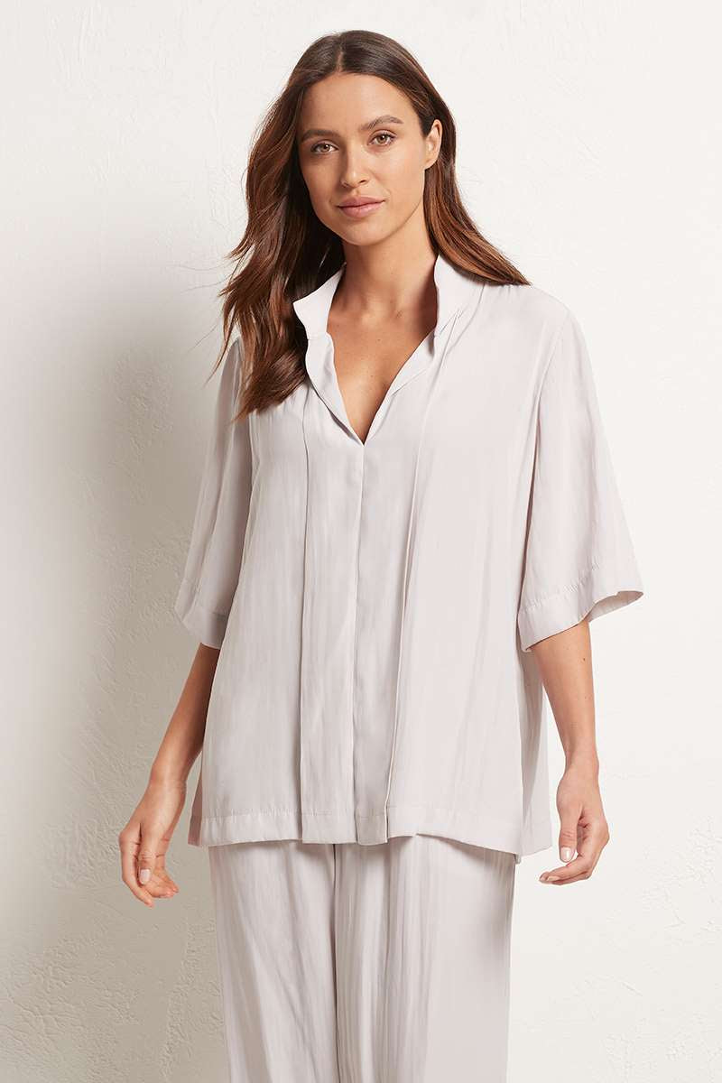 Cut from Mache, known for its relaxed fluidity and smooth lustre surface. The Bevel Neck Plaza features sophisticated pleat detailing down the front & a flattering elbow length sleeve.