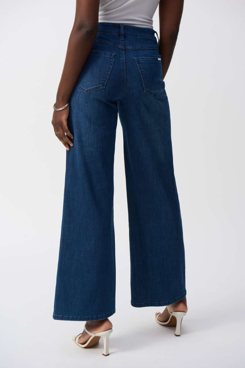The GOLDIE classic wide-leg denim pants are anything but low-key. Crafted from a lightweight modal blend, super soft, stretchy Joseph Ribkoff FEATHERWEAVE denim, that hugs your curves in all the right ways, you'll be owning this iconic 70's starlet style as well as, relishing their perfect comfort. Five Pocket Style. See Below for Size and fit.