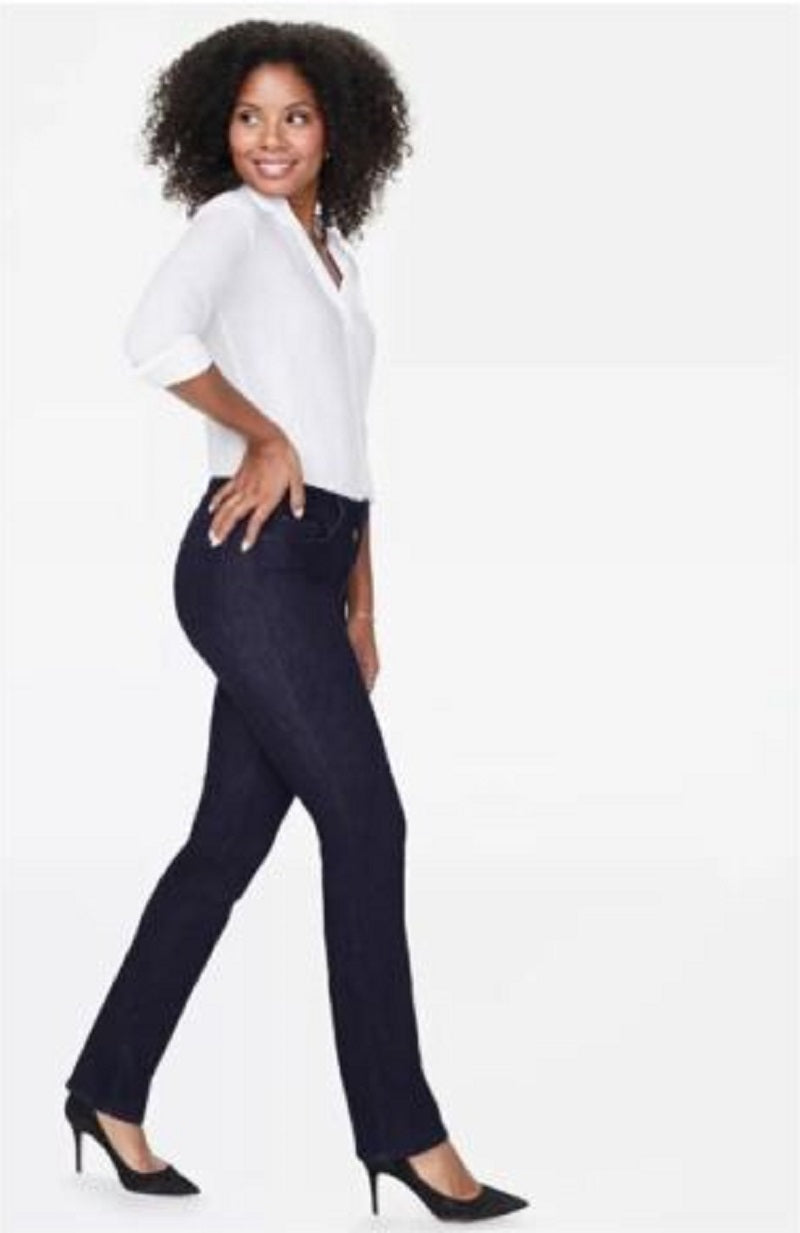The easy, figure-elongating construction of the NYDJ Marilyn Straight in Premium Denim pairs well with everything, thanks to a flattering waist and versatile, straight fit. Lift Tuck® Technology uses a proprietary slimming panel with a patented criss-cross design to shape and support your curves for an always-sleek silhouette, so you can look, feel and Wear one size smaller. A dark, dimensional wash increases the appeal of this statement style. Features classic five-pocket styling, zip fly and button closure.