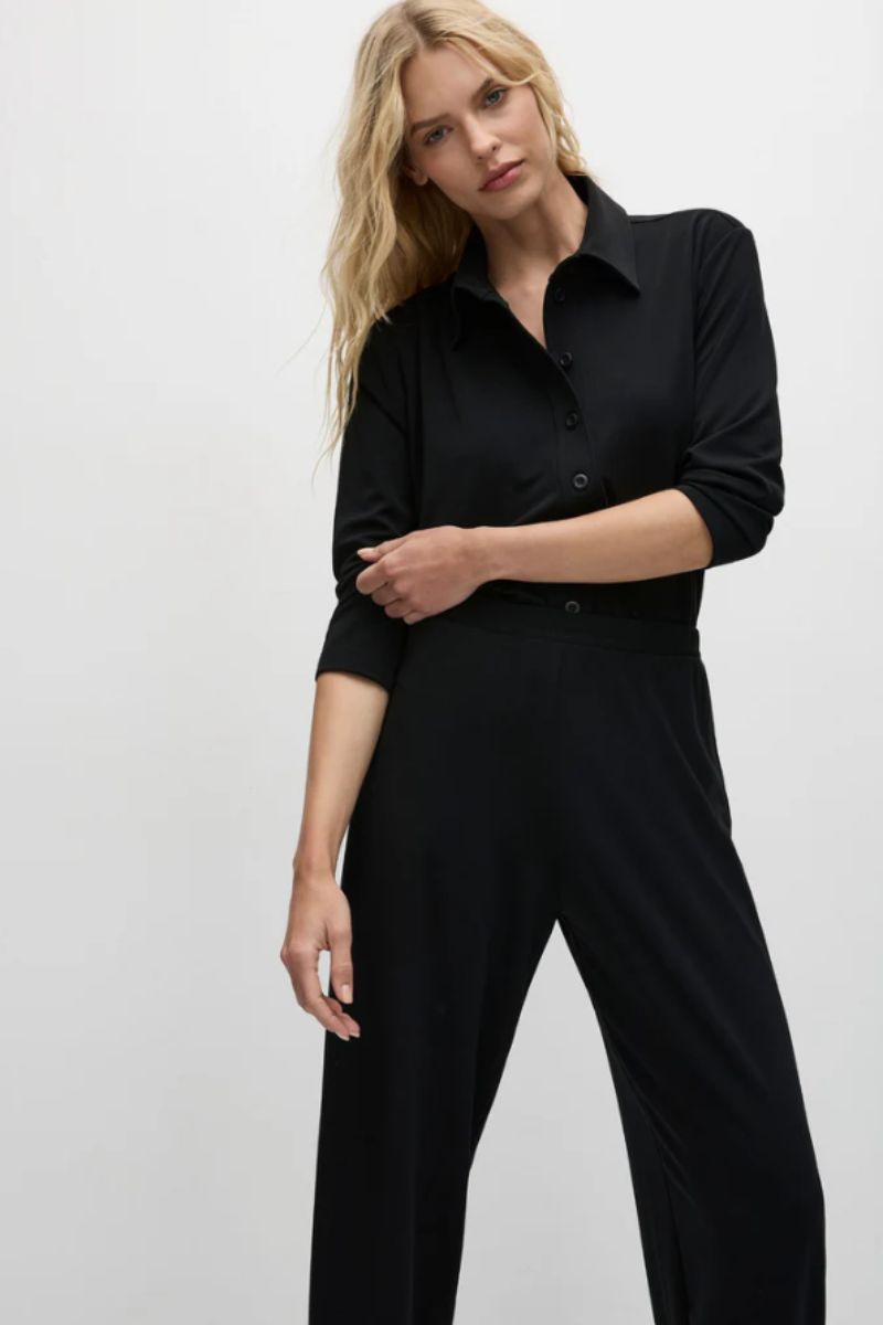 Woman sitting on a stool wearing Mela Purdie Tab Stand Henley F007 8625 in black with black tabbed pants
